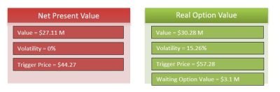 Industry relies heavily on static DCF techniques—such as a project’s net present value (NPV) or internal rate of return (IRR)—which implicitly assume that the only decision that matters is the initial decision to invest. In the real world, however, managers must actively oversee projects within a dynamic operating environment and continuously make decisions related to whether or not they should expand or contract a project, abandon one, or simply wait for more information before acting. ROV supports this need for constant decision making, and is therefore particularly applicable for commodity-producing firms, where uncertainty is especially high due to changing market prices and where managers have a substantial ability to respond to this uncertainty by delaying investment until optimal market conditions of the produced commodity are reached.